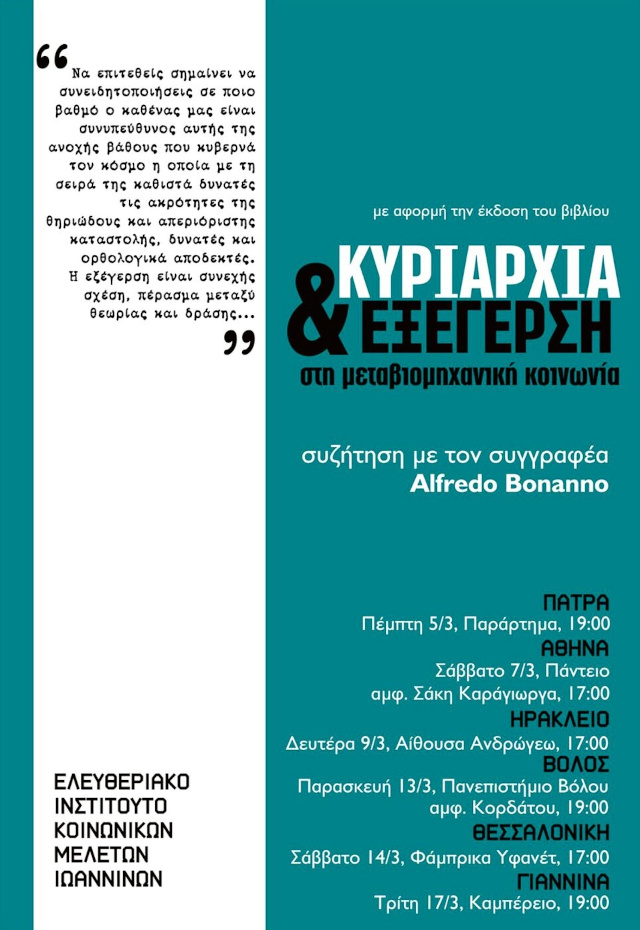 Ηχογράφηση της εκδήλωσης «Κυριαρχία & Εξέγερση στη μεταβιομηχανική κοινωνία», συζήτηση με τον συγγραφέα Alfredo Bonanno.