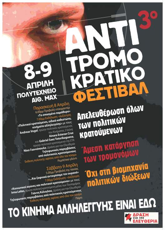 Το 3ο Αντιτρομοκρατικό Φεστιβάλ, θέλουμε να αποτελέσει, εκτός από χώρο κατάθεσης συλλογικών εμπειριών αντίστασης και αλληλεγγύης από την Ευρώπη και τη Λατινική Αμερική, και μια ευκαιρία συζήτησης και προβληματισμού για τη συγκυρία. Η παρουσία και συμμετοχή ανθρώπων από διαφορετικές πολιτικές διαδρομές, αλλά με κοινή επιλογή και επιδίωξη η αλληλεγγύη να αποτελεί πάντα οργανική συνιστώσα του ευρύτερου ανατρεπτικού κινήματος, περιμένουμε να συμβάλει σημαντικά στη διεύρυνση του κινήματος αλληλεγγύης στους πολιτικούς κρατούμενους