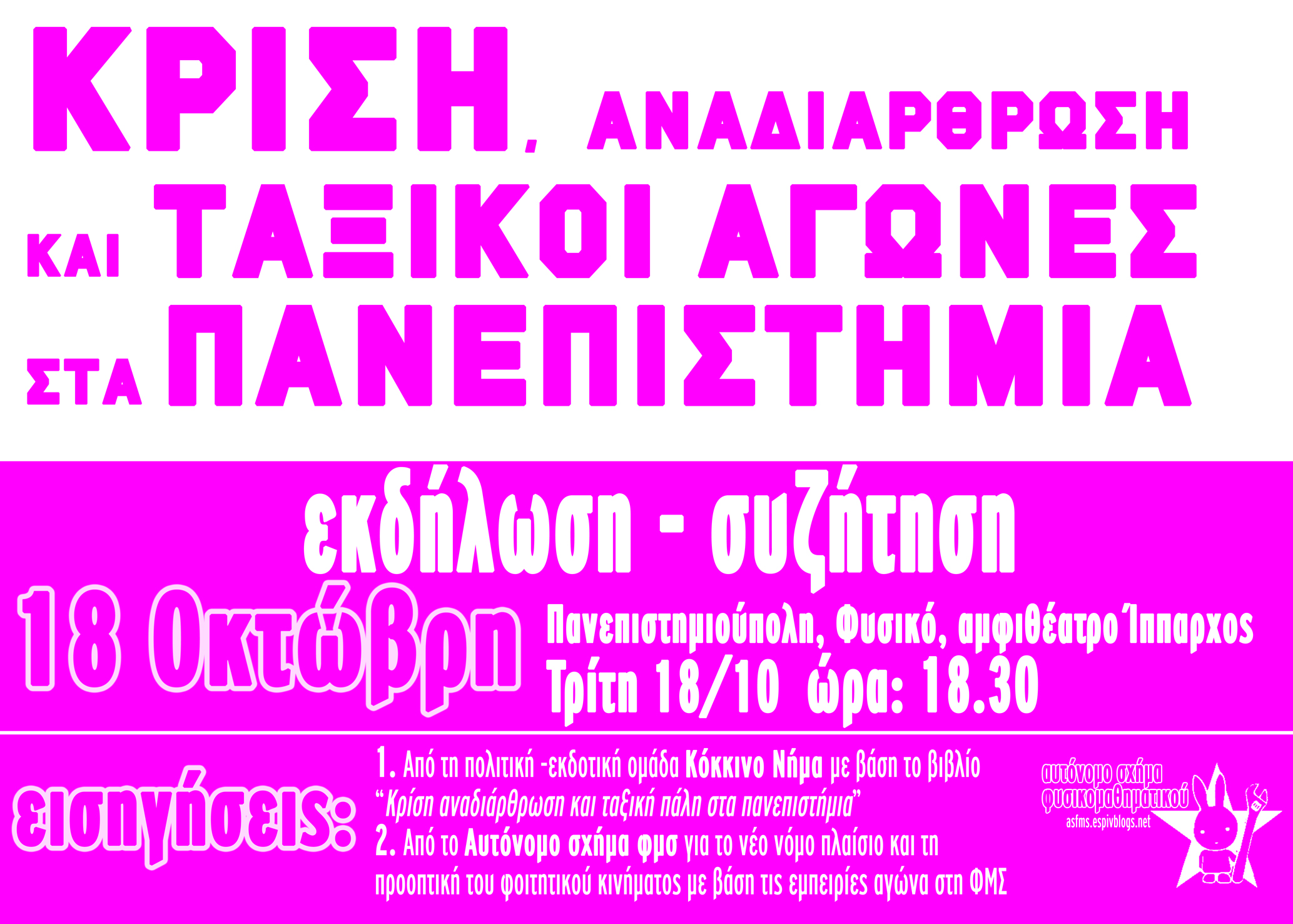 Ηχογράφηση της εκδήλωσης-συζήτησης «Κρίση, αναδιάρθρωση και ταξική πάλη στα Πανεπιστήμια» η οποία πραγματοποιήθηκε στις 18 Οκτωβρίου 2011 στο Φυσικό του Πανεπιστημίου της Αθήνας και διοργανώθηκε από το Αυτόνομο Σχήμα Φυσικομαθηματικού: https://www.kinimatorama.net/event/13879