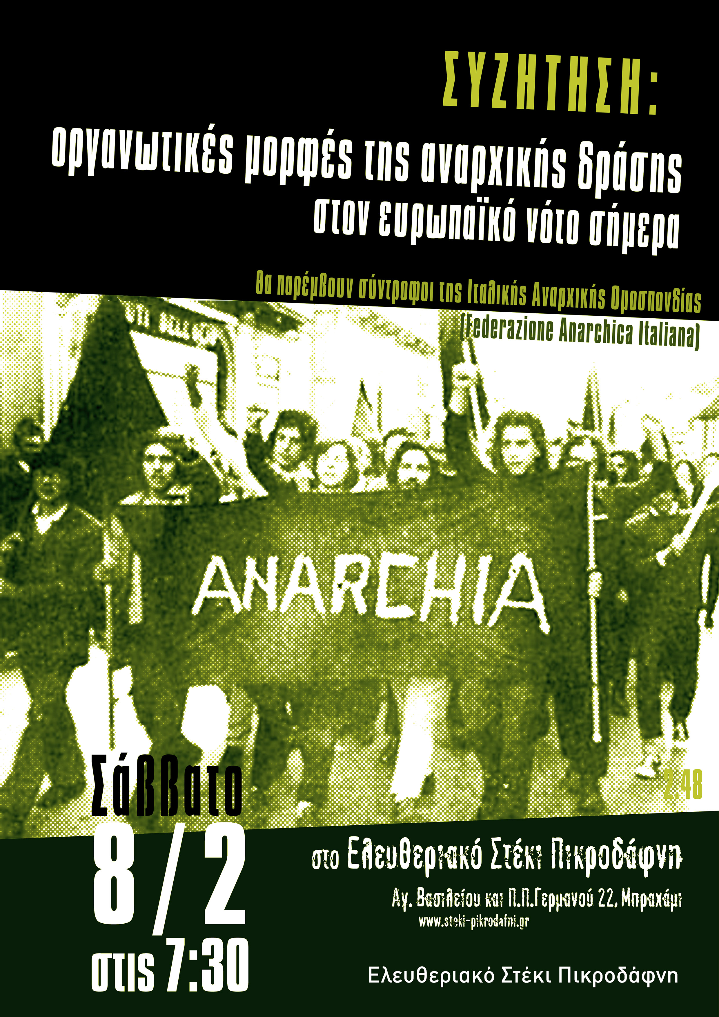 Ηχογράφηση της συζήτησης «Οργανωτικές μορφές της αναρχικής δράσης στον ευρωπαϊκό νότο σήμερα», με παρέμβαση συντρόφων της Iταλικής Aναρχικής Ομοσπονδίας.