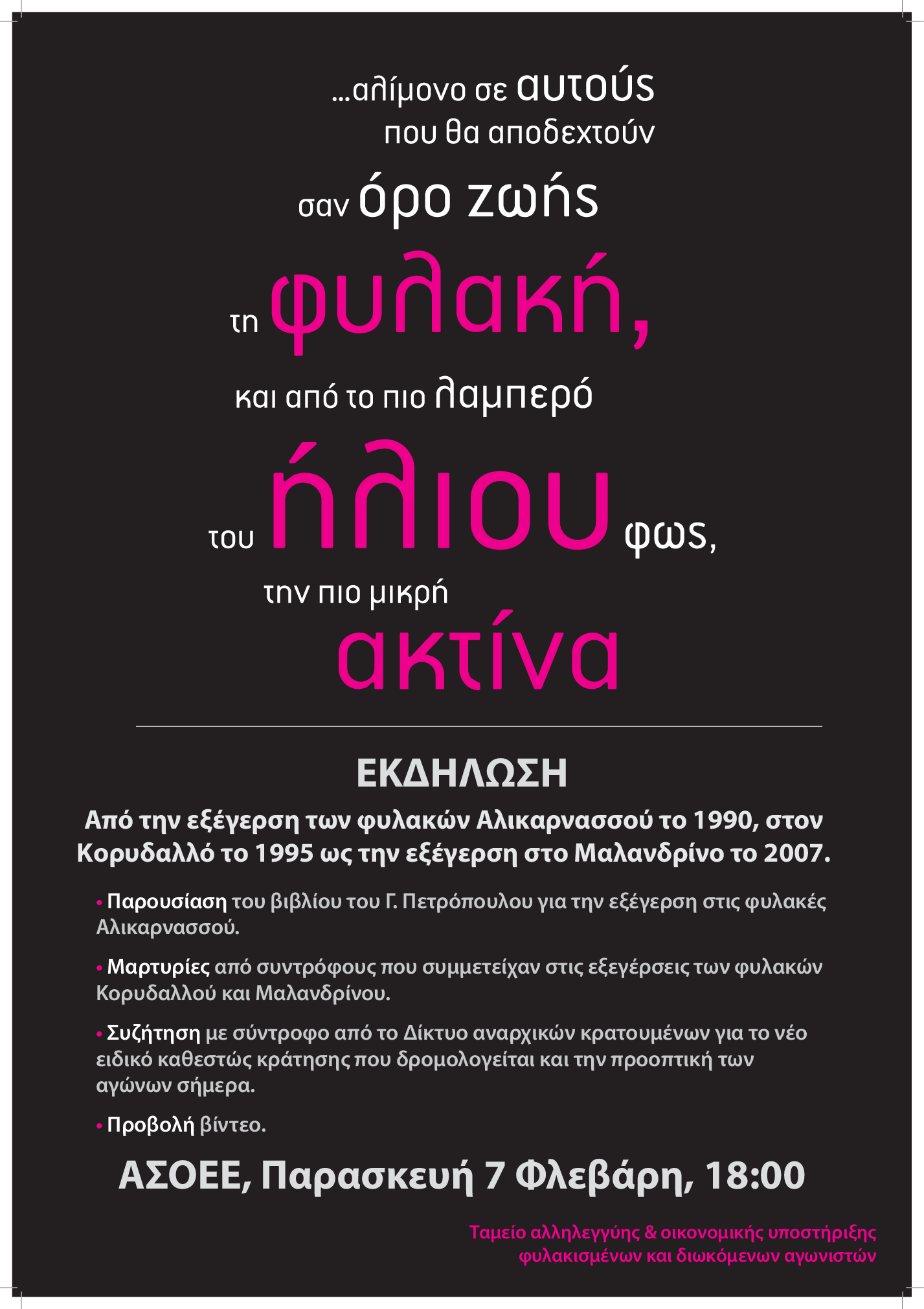 - Μαρτυρίες από συντρόφους που συμμετείχαν στις εξεγέρσεις των φυλακών Κορυδαλλού και Μαλανδρίνου.