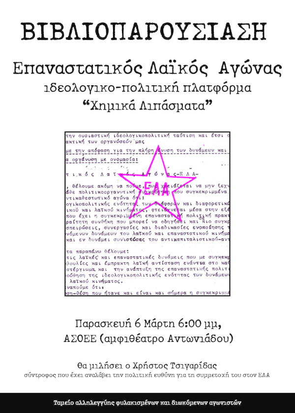 Ηχογράφηση της βιβλιοπαρουσίασης-εκδήλωσης «Επαναστικός Λαϊκός Αγώνας, ιδεολογικο-πολιτική πλατφόρμα “Χημικά Λιπάσματα”», συζήτηση με τον Χρήστο Τσιγαρίδα.