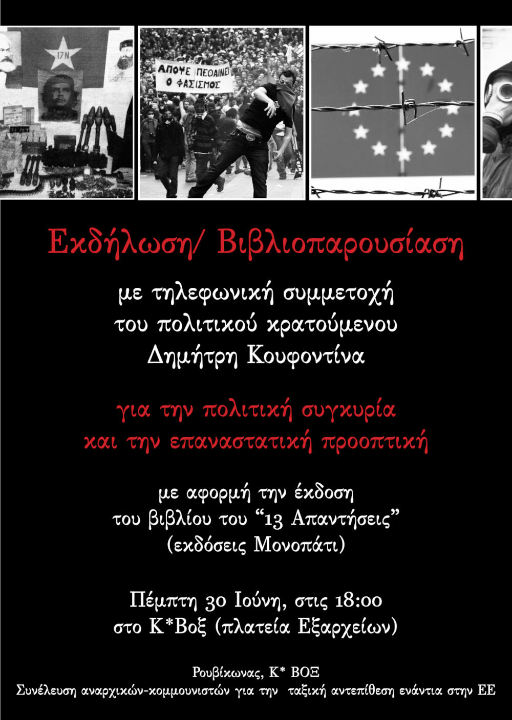 Η εκδήλωση πραγματοποιήθηκε στις 30 Ιουνίου 2016 στην κατάληψη Κ*Βοξ στην Αθήνα και διοργανώθηκε από τον Ρουβίκωνα, το Κ*Βοξ και την Συνέλευση αναρχικών-κομμουνιστών για την ταξική αντεπίθεση ενάντια στην ΕΕ: https://www.kinimatorama.net/event/69857