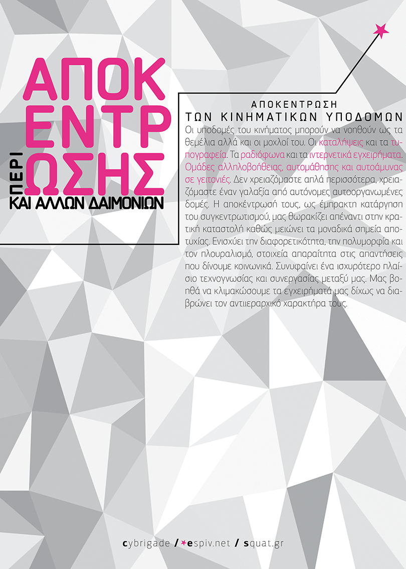 Οι υποδομές του κινήματος μπορούν να νοηθούν ως τα θεμέλια αλλά και οι μοχλοί του. Οι καταλήψεις και τα τυπογραφεία. Τα ραδιόφωνα και τα ιντερνετικά εγχειρήματα. Ομάδες αλληλοβοήθειας, αυτομάθησης και αυτοάμυνας σε γειτονιές. Δεν χρειαζόμαστε απλά περισσότερα, χρειαζόμαστε έναν γαλαξία από αυτόνομες αυτοοργανωμένες δομές. Η αποκέντρωσή τους, ως έμπρακτη κατάργηση του συγκεντρωτισμού, μας θωρακίζει απέναντι στην κρατική καταστολή καθώς μειώνει τα μοναδικά σημεία αποτυχίας. Ενισχύει την διαφορετικότητα, την πολυμορφία και τον πλουραλισμό, στοιχεία απαραίτητα στις απαντήσεις που δίνουμε κοινωνικά. Συνυφαίνει ένα ισχυρότερο πλαίσιο τεχνογνωσίας και συνεργασίας μεταξύ μας. Και μας βοηθά να κλιμακώσουμε τα εγχειρήματά μας δίχως να διαβρώνει τον αντιιεραρχικό χαρακτήρα τους.